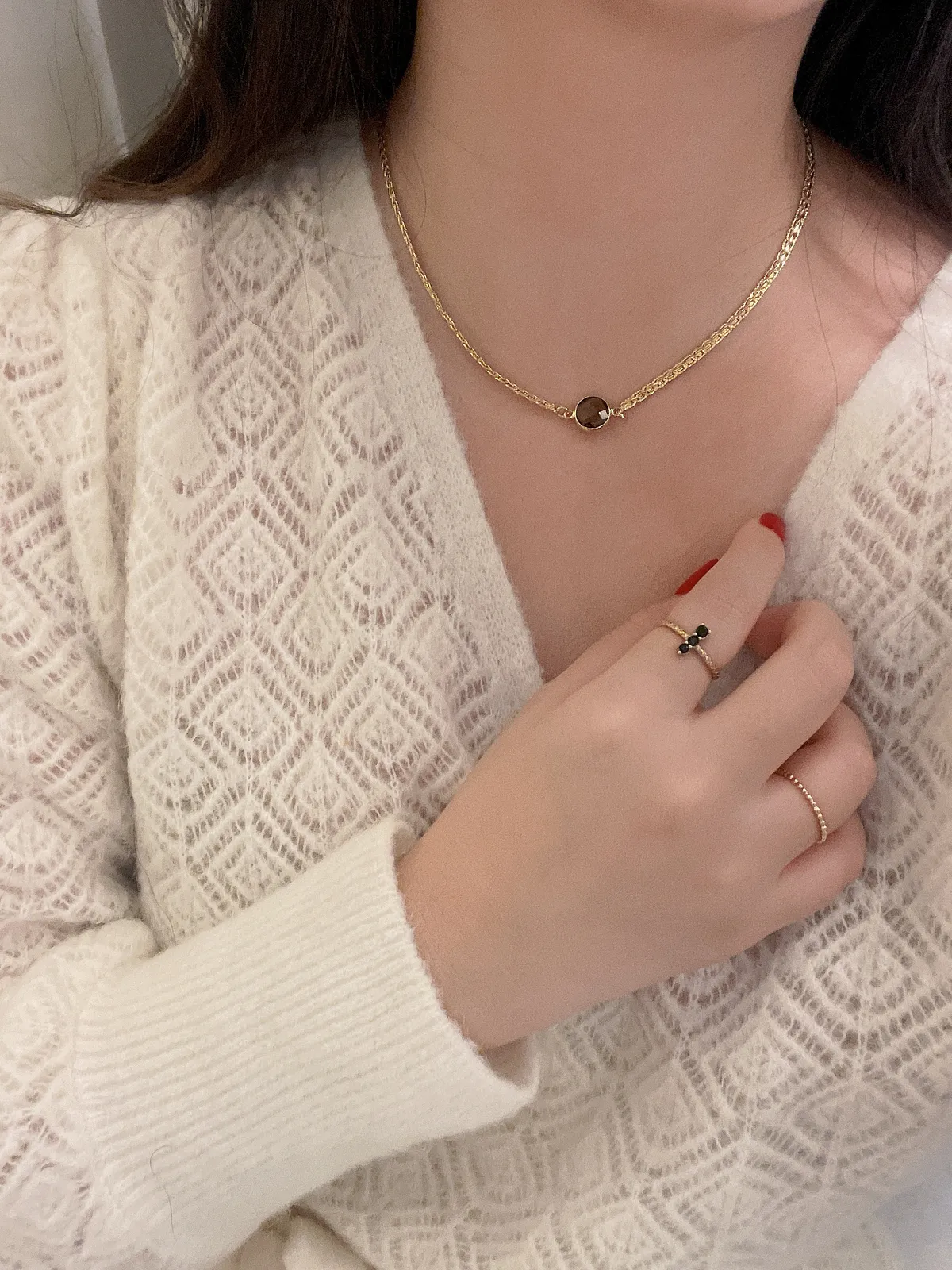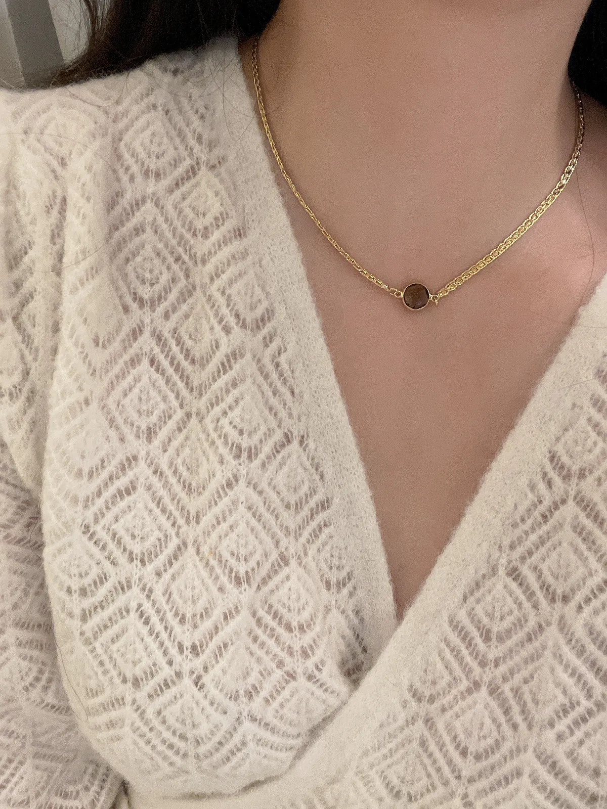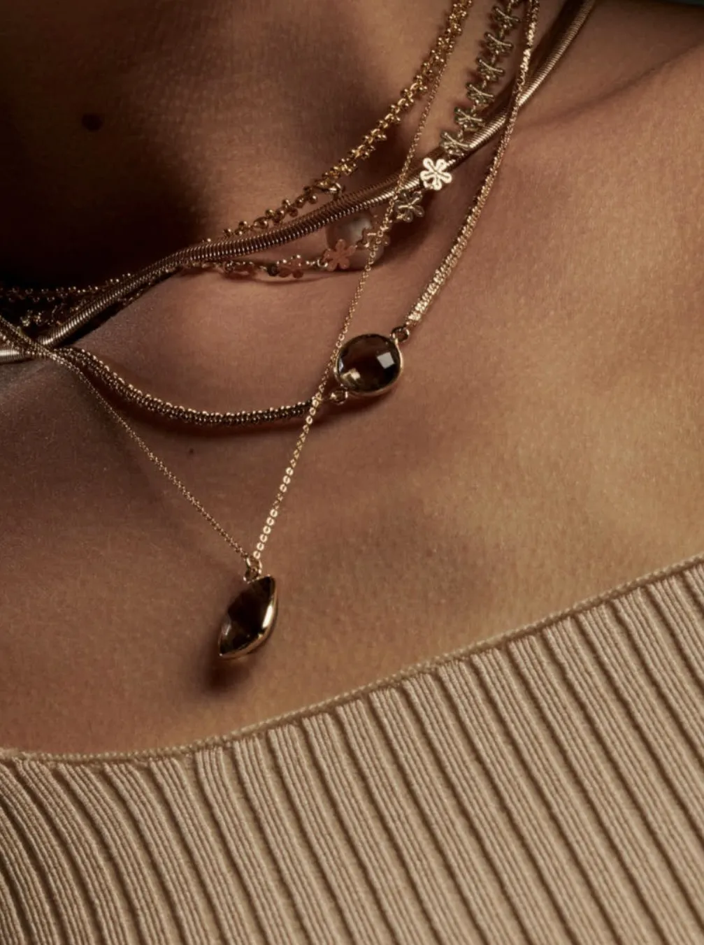 MAI 煙燻石英項鍊 煙燻石英隨著陽光不同角度下 呈現著棕黑的閃耀色澤 在東方文化中的風水學上 煙燻石英寶石能夠提升事業/學業的運勢 法國人也非常喜歡配戴煙燻石英 無論中西方 都相信著天然晶石能夠帶給自己好的能量 材質:銅鍍18K 3微米真金鏈條&煙燻石英