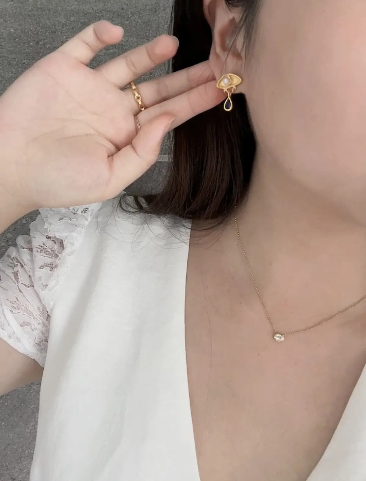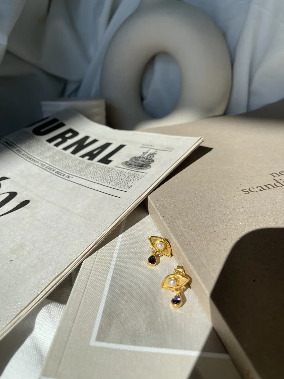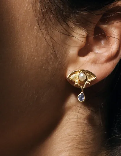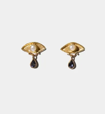 Imperfect eye shape stud earrings adorned with freshwater pearls and iolite teardrop gemstones.