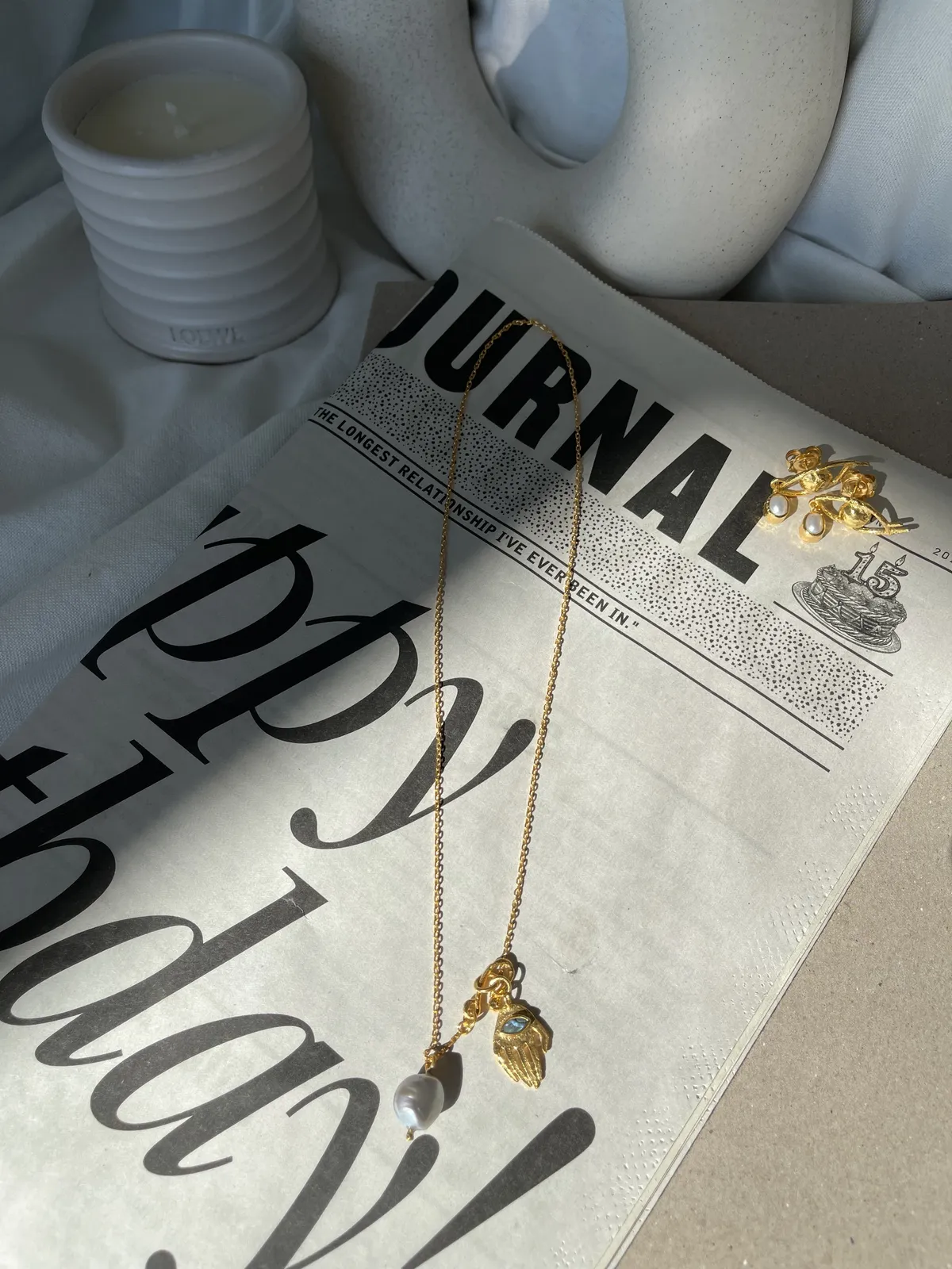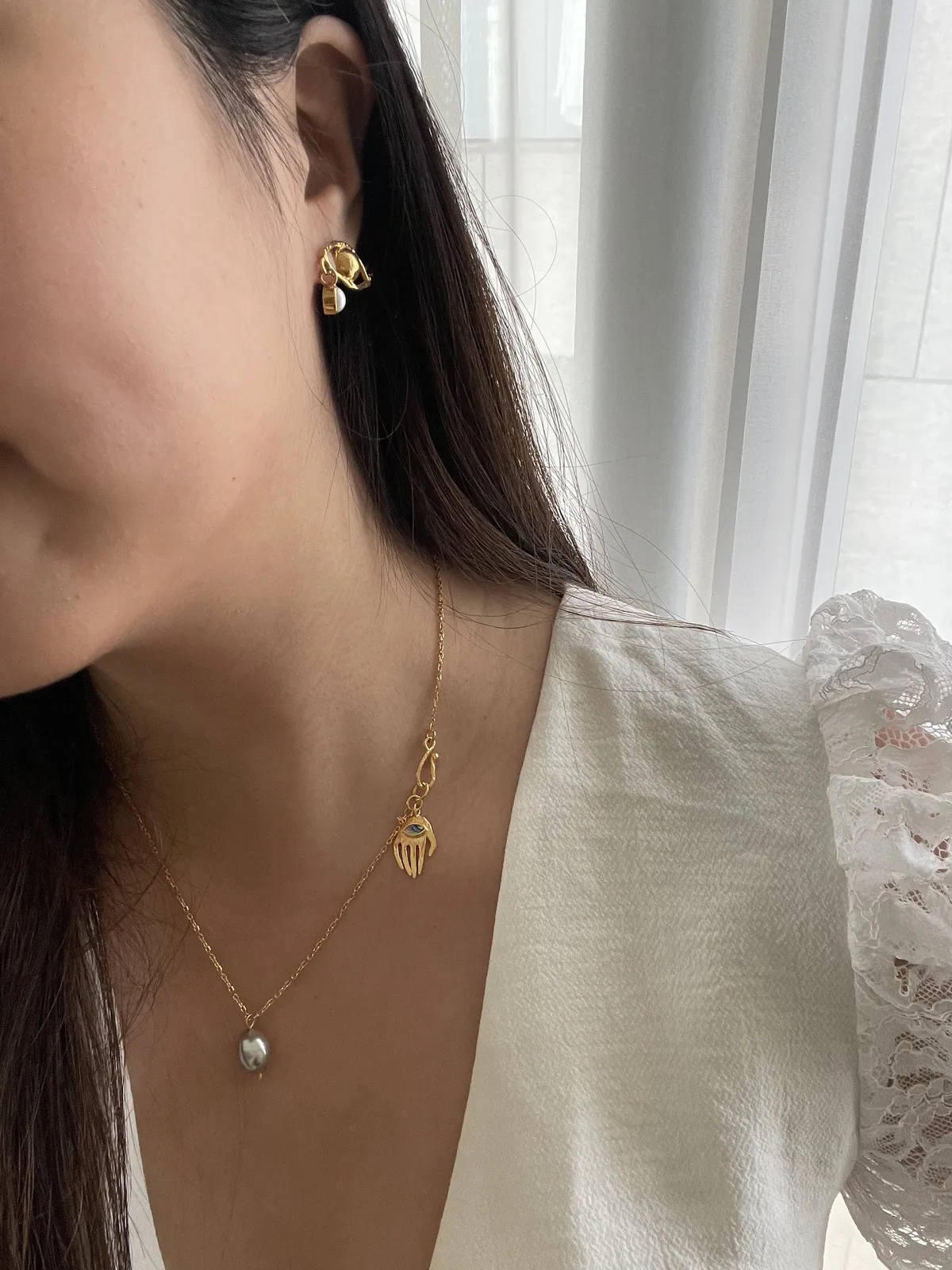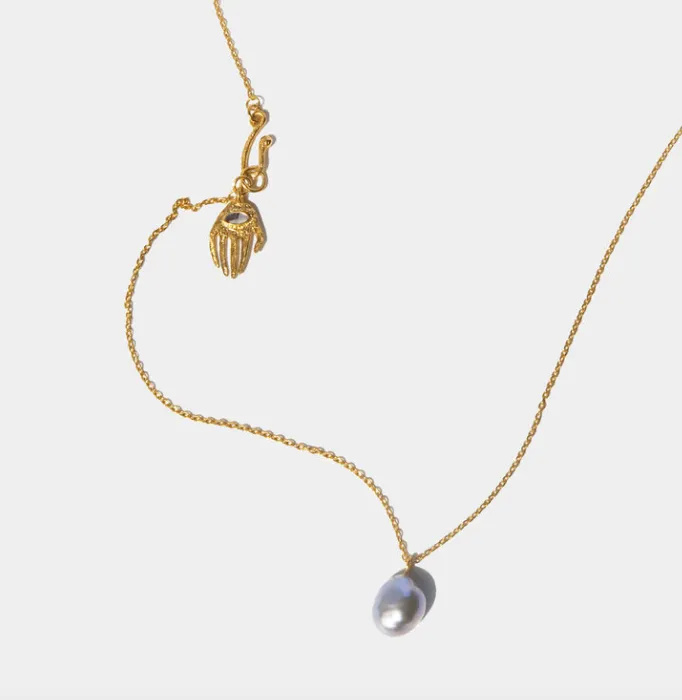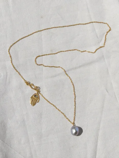 Long chain necklace with greyish light blue Keshi pearl. Handmade clasp with Abalone Hand talisman.