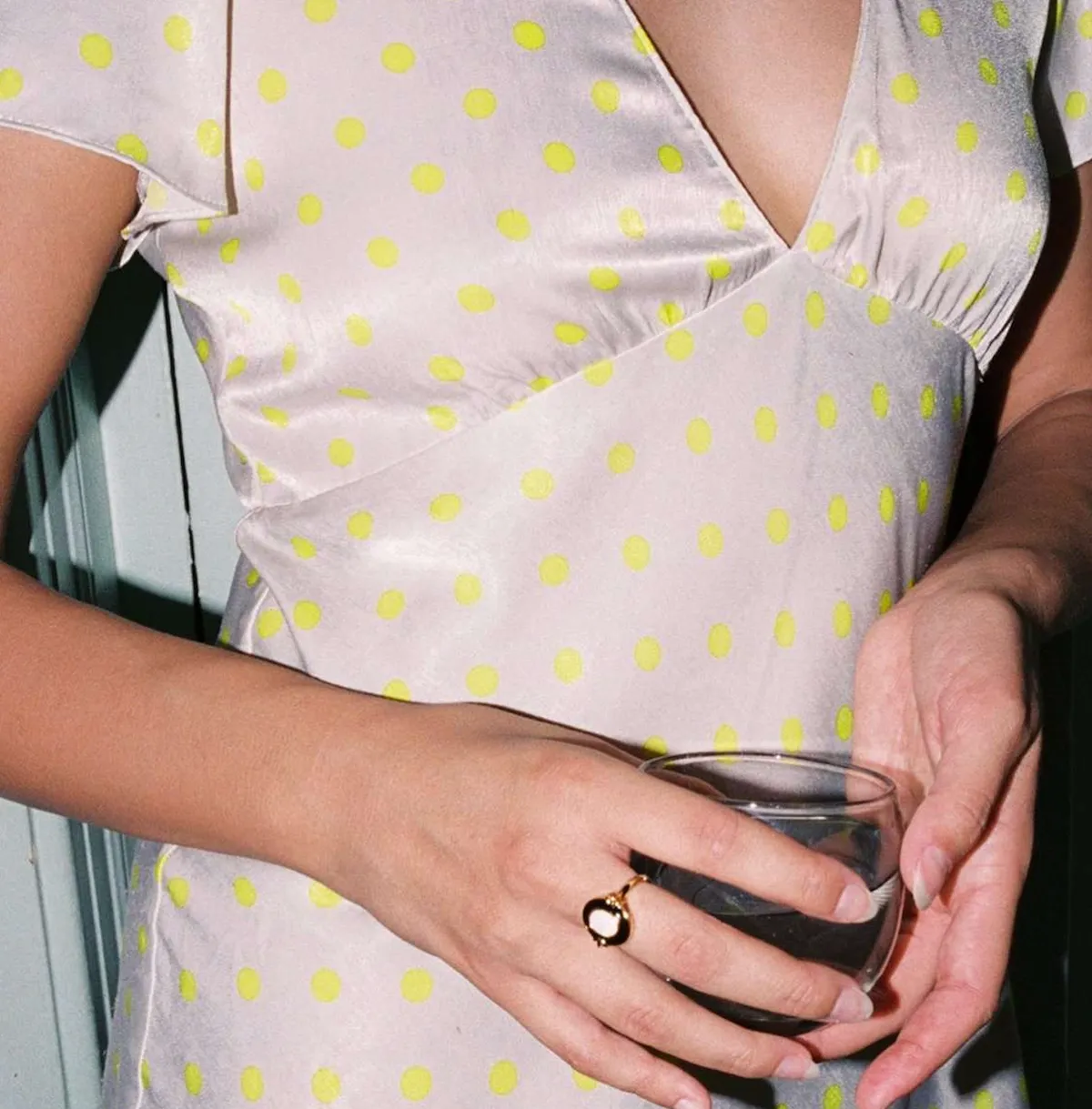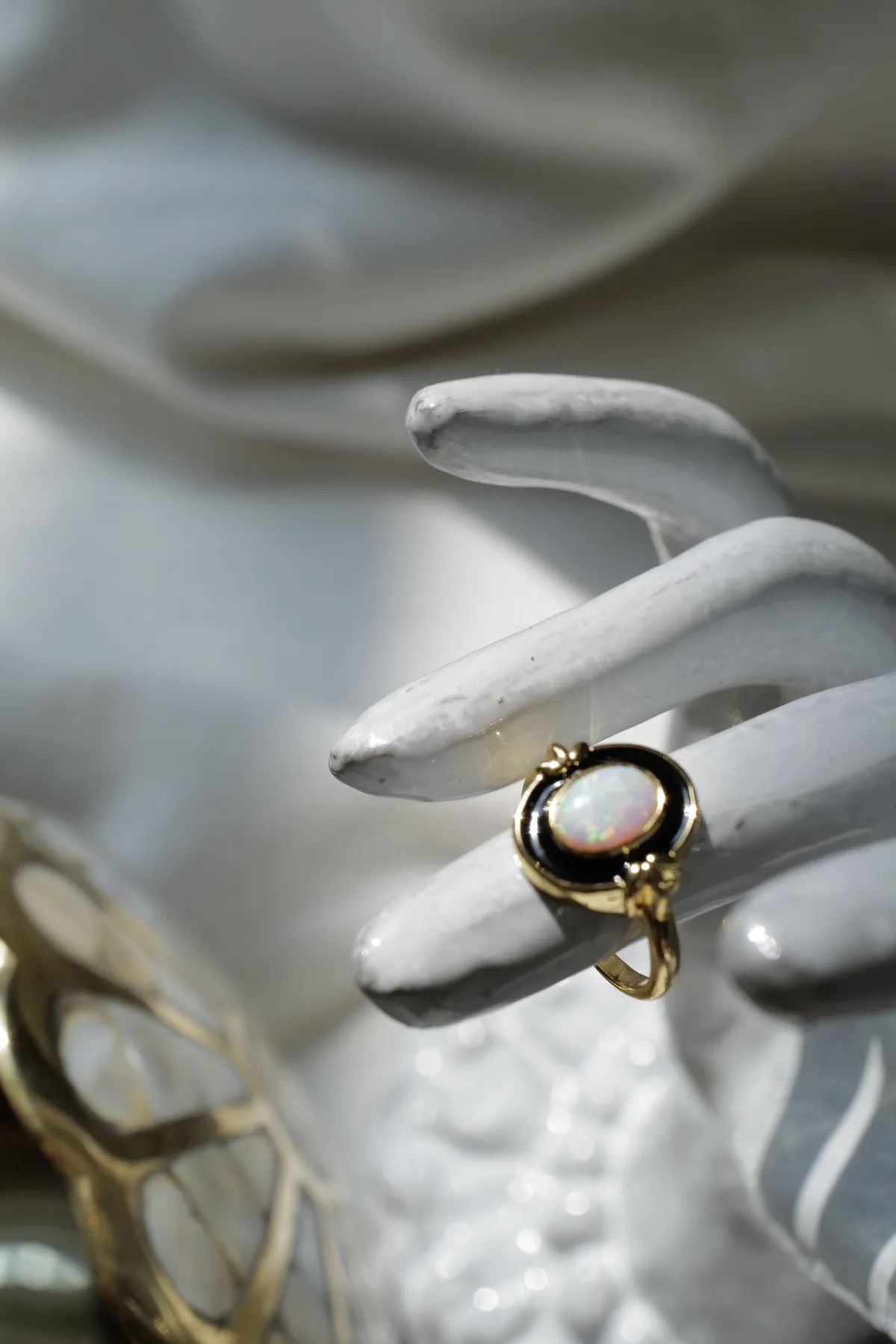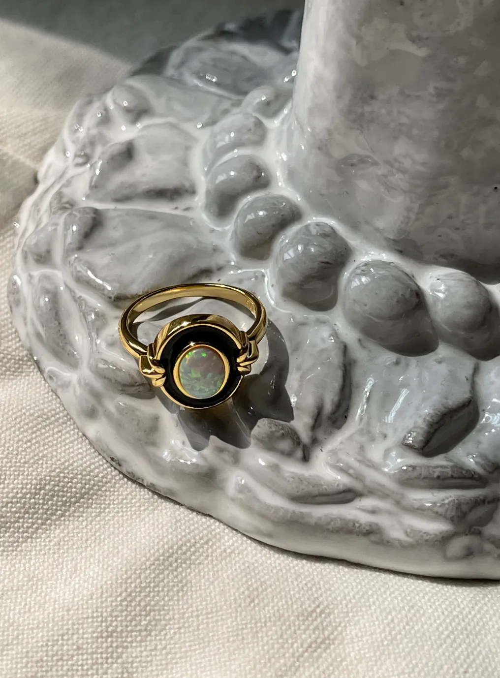 Breakfast Ring 材質:18k 鍍金純銀手工製作:厚金層覆蓋在 925 純銀和實驗室培育的蛋白石上。Handcrafted in 18k yellow gold vermeil: a thick gold layer on 925 sterling silver & lab-grown opal.