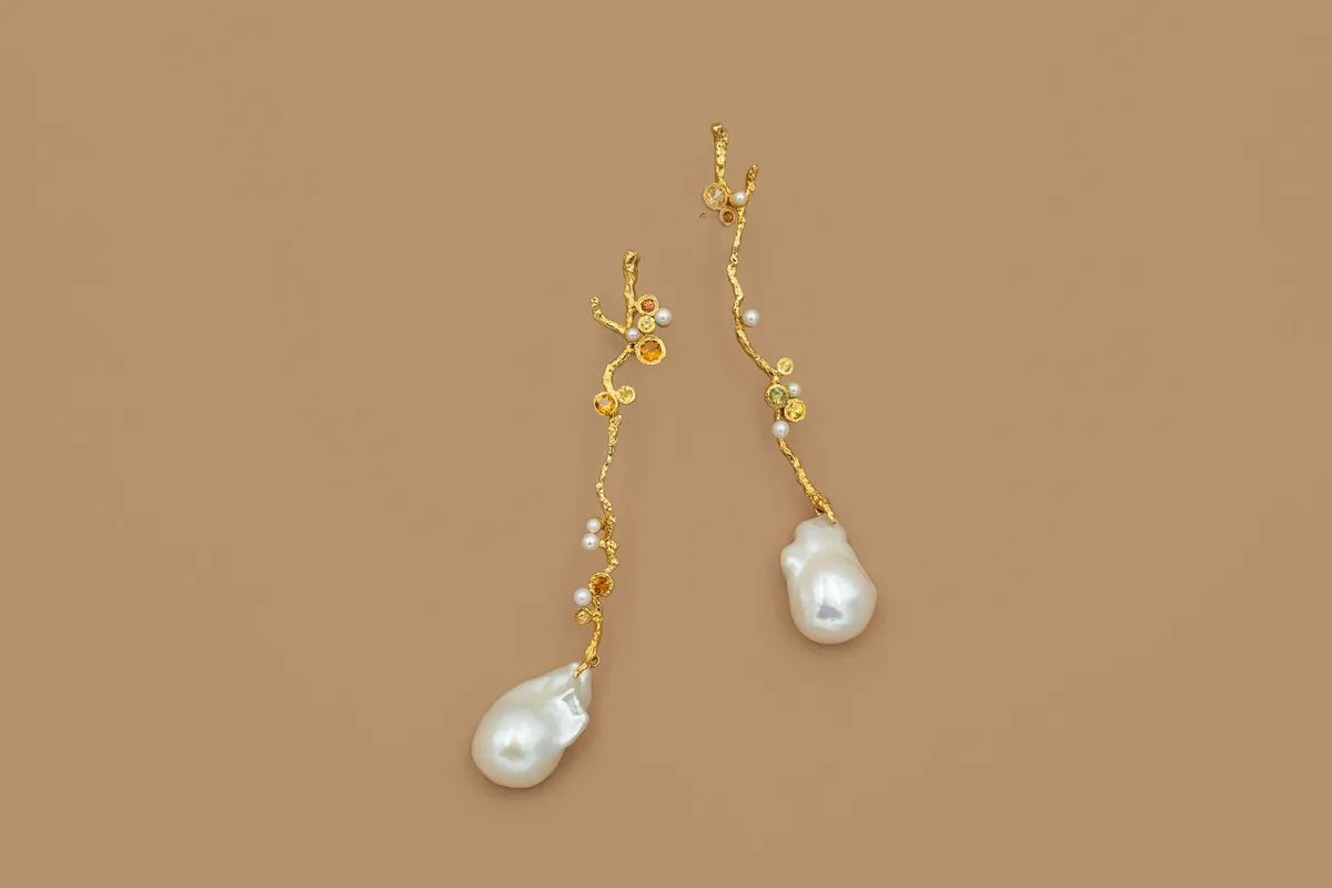 Baroque Floret 耳環這些手工製作的耳環慶祝春天的美麗。 花蕾、小花和幼樺樹啟發了耳環的形狀和質地巴洛克風格的珍珠為耳環增添了隨性優雅的感覺,而黃色藍寶石則為耳環增添了柔和的女性氣質每對珍珠均由我們的設計師手工挑选和配對,以確保您收到最獨特的配對耳環藍寶石也經過精心配對,融合了黃色藍寶石的 3 種色調材質:純銀鍍18k金&各色寶石
