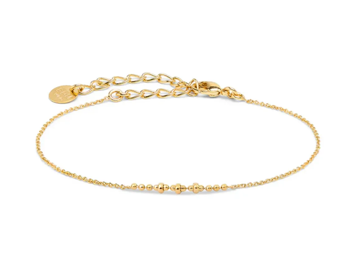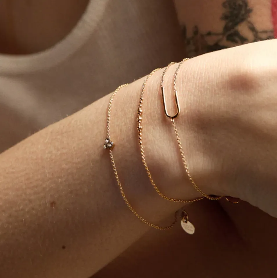 Océane 手鍊 珠寶採用 24K 鍍金,以確保長久的使用壽命它們不含任何過敏金屬,只含黃銅、銅和金為了確保它們可以使用很多年,請避免將它們接觸化學物質、化妝品或香水。游泳或運動時請勿佩戴,並將其存放在小袋中。要清潔一件珠寶,只需用一塊柔軟的乾布就可以恢復其光澤。鍊長:14公分+5公分調節鍊