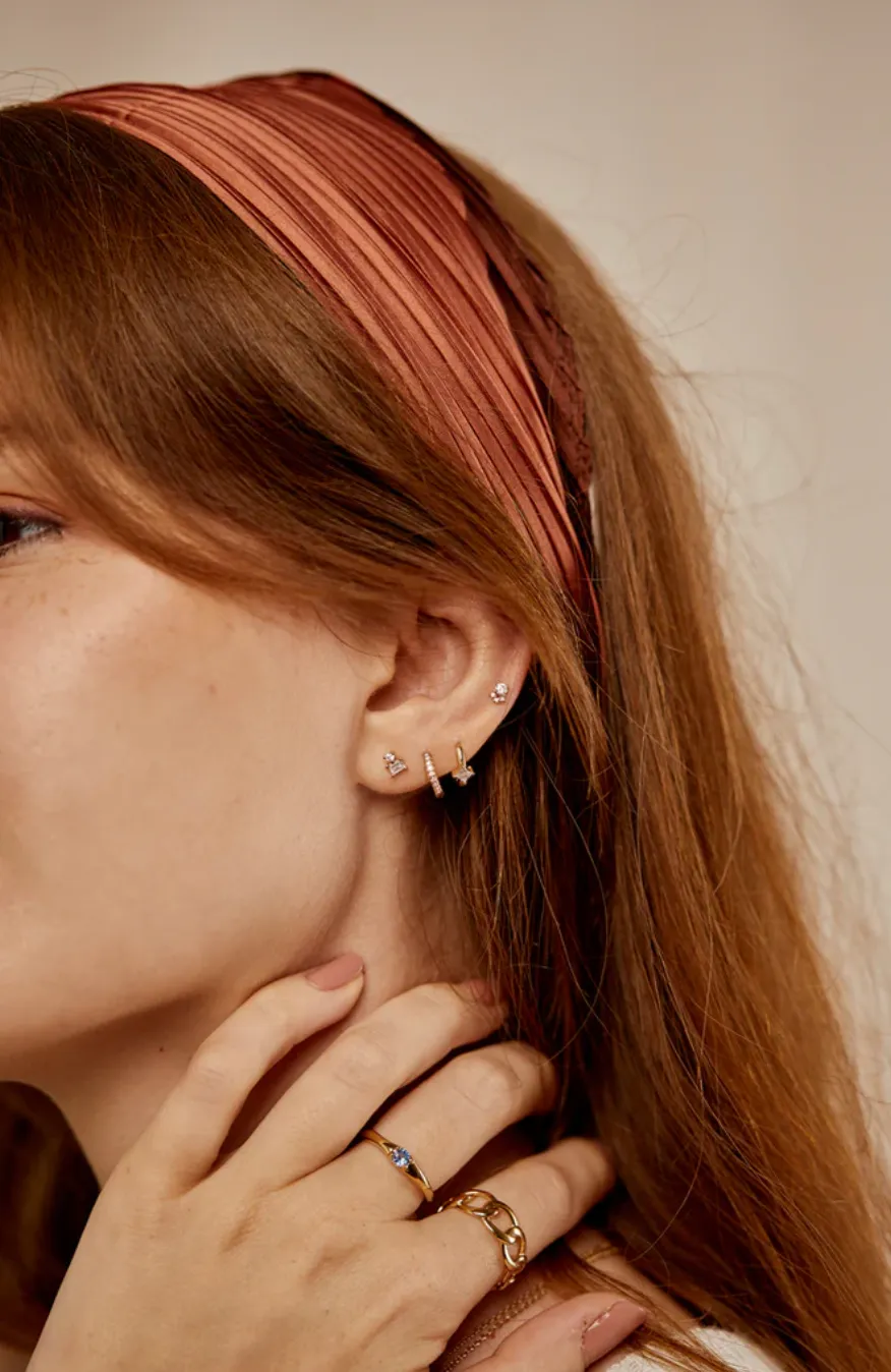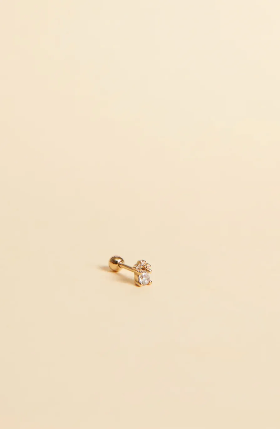 穿孔鑲嵌四顆小鋯石,鍍5微米金。適合用於耳垂、耳輪或耳垂。