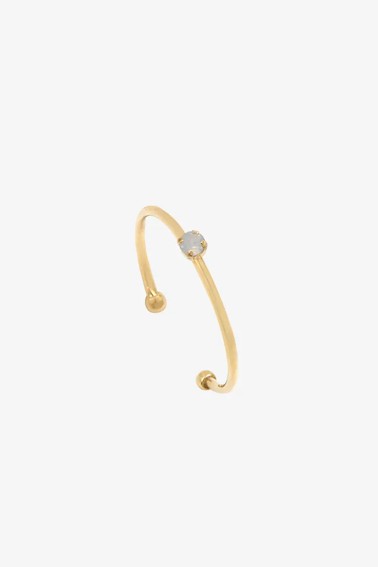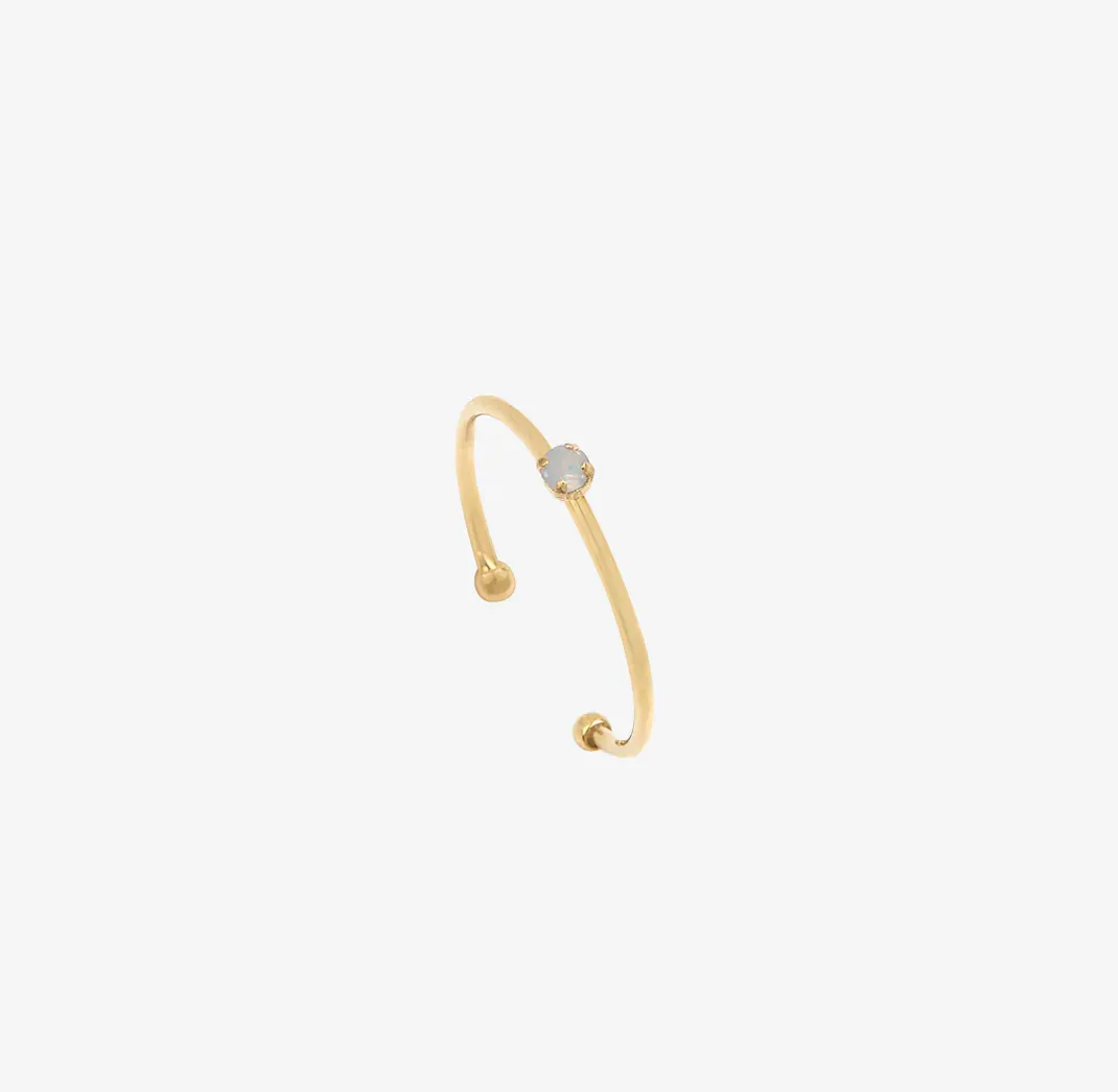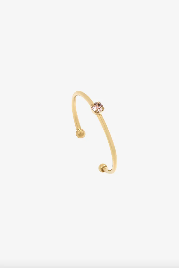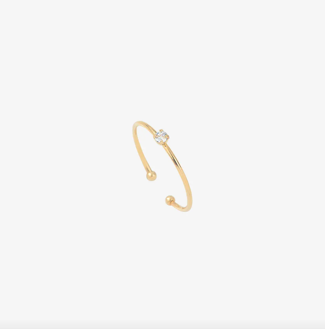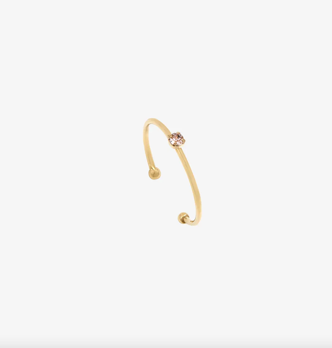 這款可調節戒指為 單石款式(solitaire),中央鑲嵌一顆 直徑 2 公釐的圓形水晶,